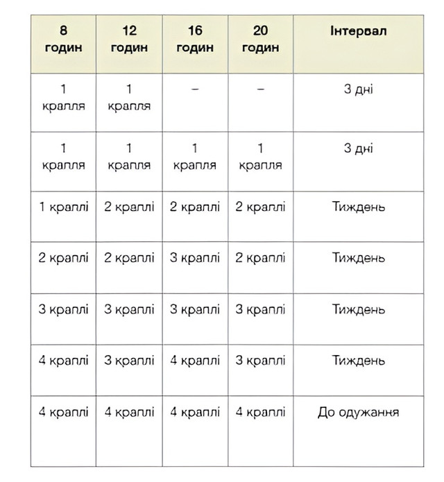 5 крапель 3 рази на день, додаючи щодня по 1 краплі на прийом.Дійти до 30 крапель тричі на день.Потім повернутися до 5 крапель.